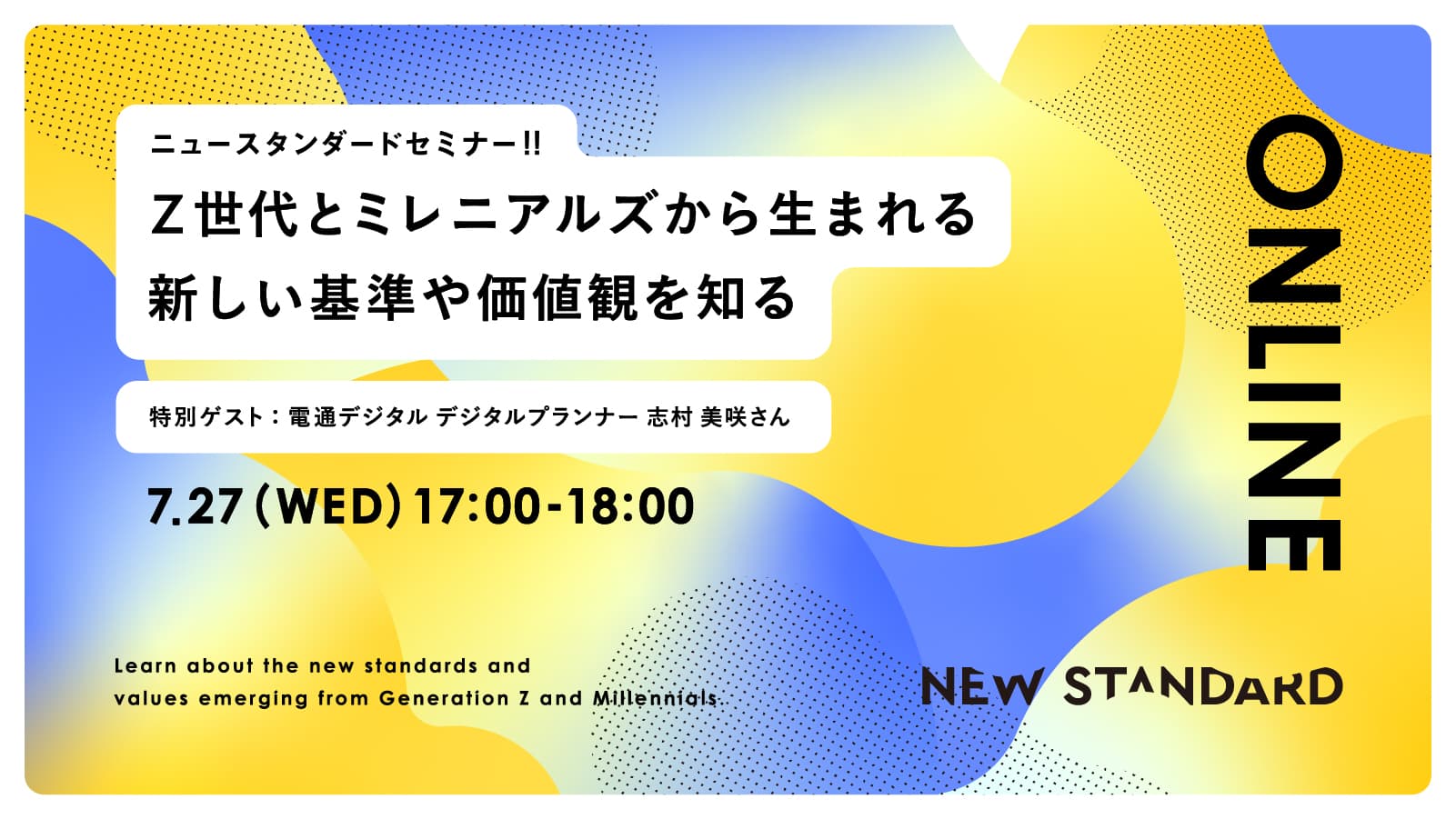 「ニュースタンダードセミナー!!」は、ミレニアルズ及びZ世代に関する調査・研究をおこなう「NEW STANDARD THINK TANK」が隔月で開催する、ミレニアルズやZ世代の生の声をお届けするWEBセミナーです。ミレニアルズやZ世代である彼/彼女らのリアルな声を起点に、国内外で今生まれている新しい基準や価値観をご紹介します。デプスインタビューでしか得られなかった貴重なインサイトや、調査レポートの読み解きなど、マーケティングやブランド開発に活かせる情報をお届けします。