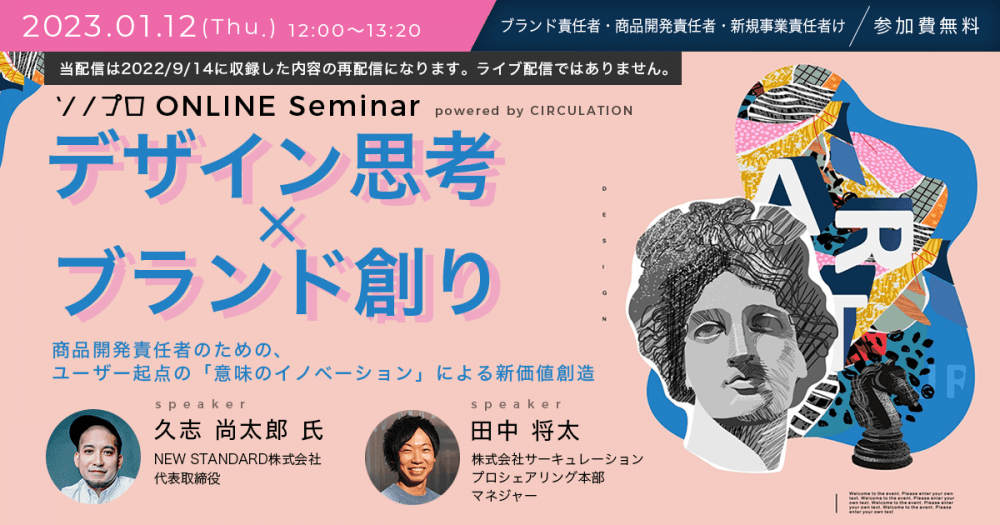 2023年1月12日(木)、株式会社サーキュレーション(https://circu.co.jp/)との共催オンラインセミナー「【デザイン思考×ブランド創り】商品開発責任者のための、ユーザー起点の『意味のイノベーション』による新価値創造」を配信いたします。