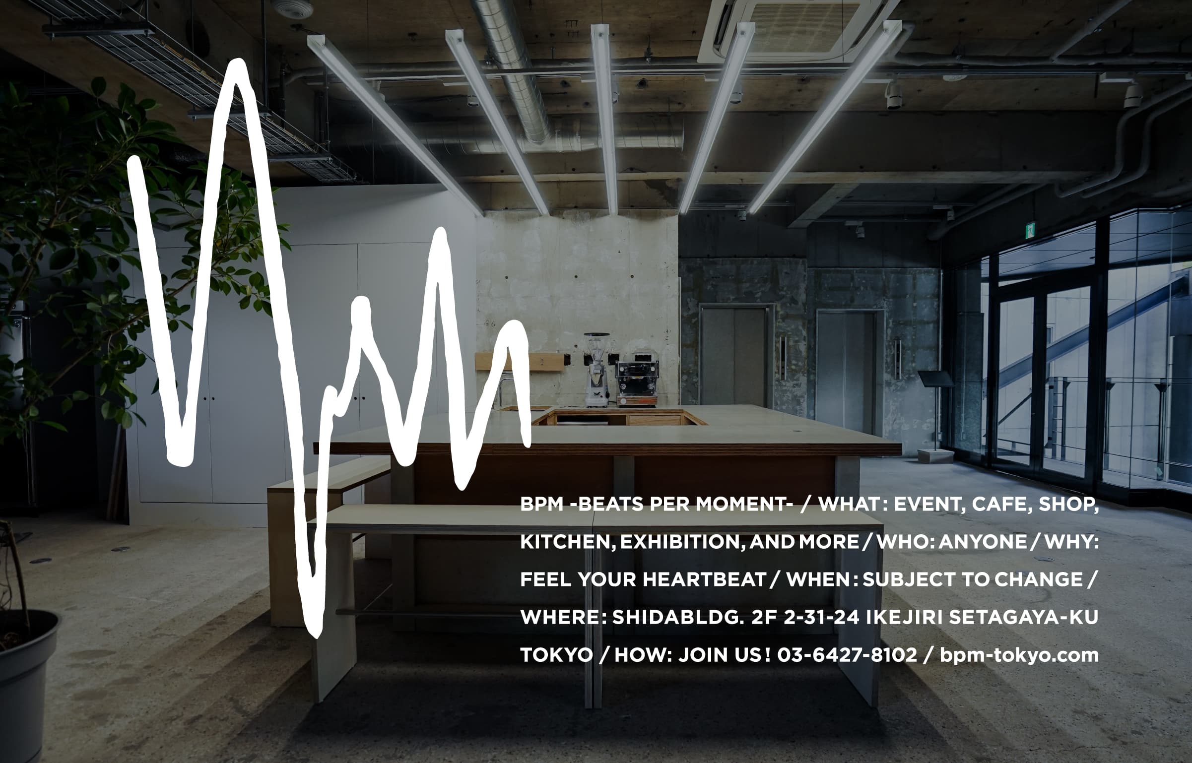 空間の名前であるBPM(=Beats Per Moment)は、この場の熱量とグルーブ感や、異なる価値観にふれることを通して、鼓動が高まる「体感」を作り出す事を意味しています。