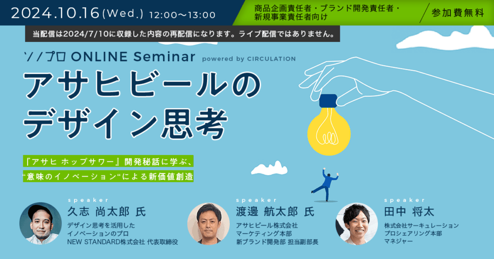 2024年10月16日(水)、株式会社サーキュレーション(https://circu.co.jp/)との共催オンラインセミナー「【アサヒビールのデザイン思考】『アサヒ ホップサワー』開発秘話に学ぶ、“意味のイノベーション”による新価値創造」 が再配信されます。