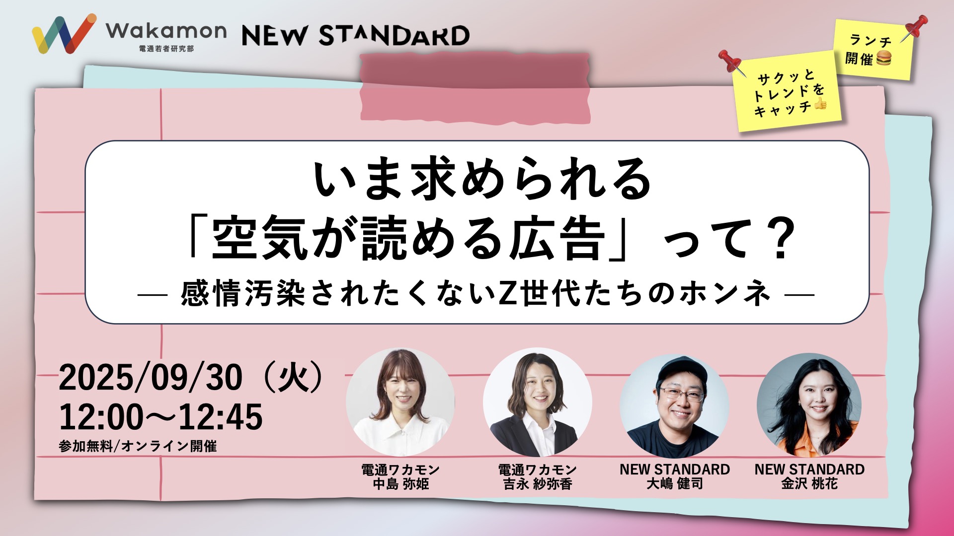 電通ワカモンの中島弥姫さん、吉永紗弥香さんと、NEW STANDARDの大嶋健司と金沢桃花が登壇。Z世代の「広告」に関する本音からインサイトを紐解くトレンドディスカッションを行います。